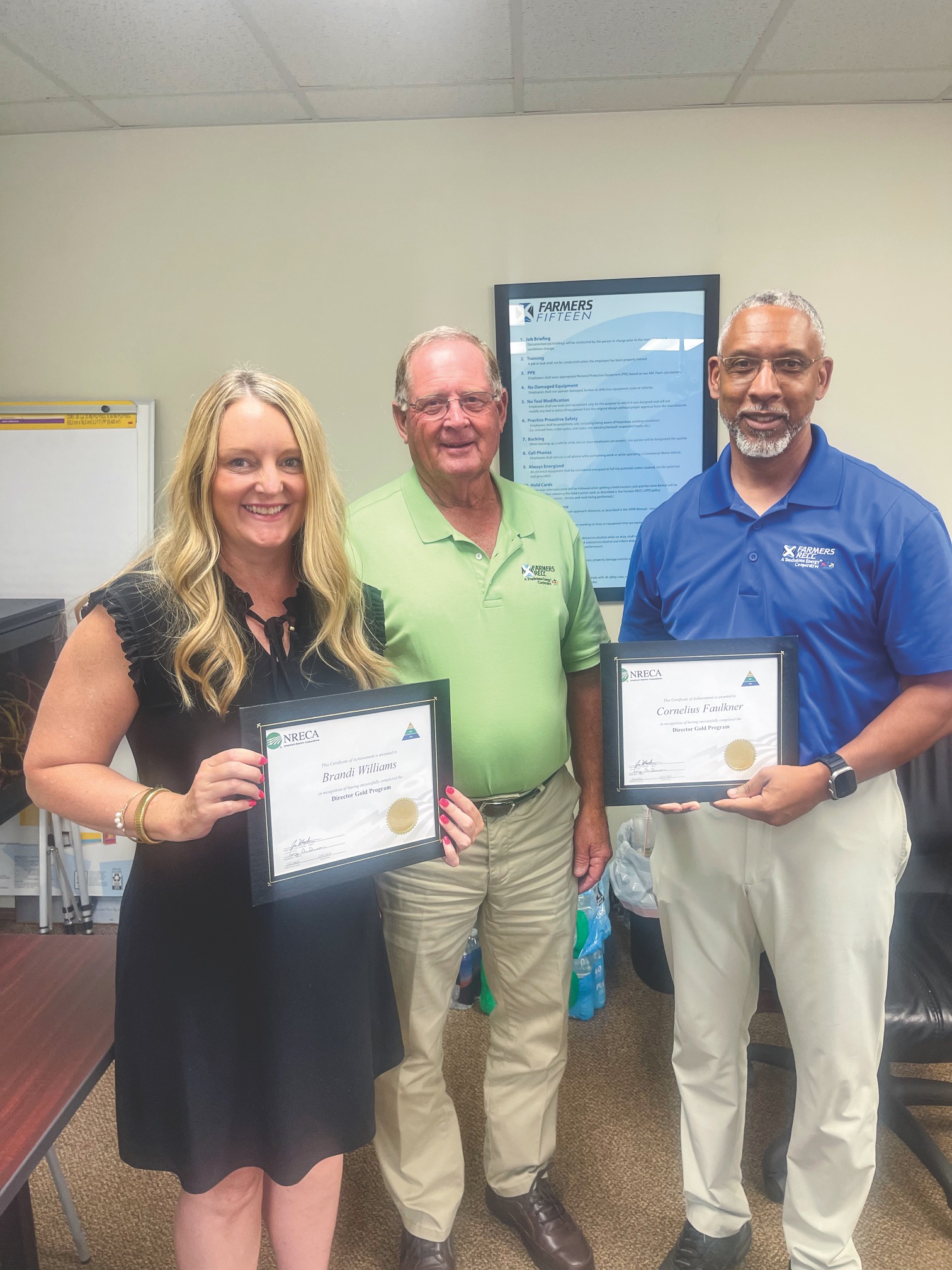 Farmers RECC Directors Brandi Williams and Cornelius Faulkner, shown with board Chairman Randy London, receive their Director Gold certificates. Photo: Caralyne Pennington
