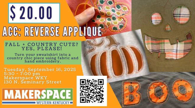 Cozy up with us for a relaxed fall evening of stitching, layering, and creating! In this hands-on workshop, you’ll learn the simple and fun textile art of reverse appliqué — where you cut away fabric layers to reveal beautiful shapes and colors beneath.