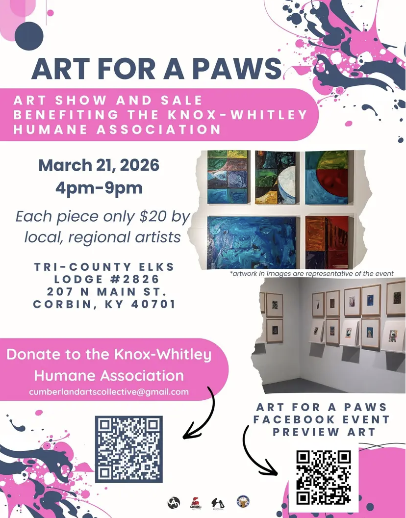 The Knox-Whitley Humane Association and Cumberland Arts Collective will host their second annual Art For A Paws fundraising event at the Elks Lodge in Corbin, KY on March 21 from 4-9pm.