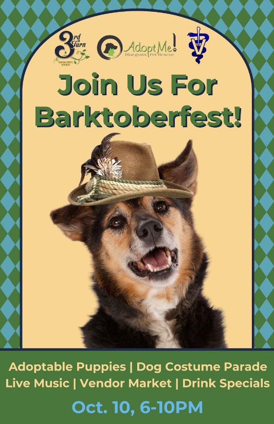 Get ready for a tail-wagging good time at Barktoberfest! This promises to be an evening packed with fun for pups and people alike. Bring your furry friends out for: Adoptale Pubppies form Bluegrass Pet Rescue; Dog Costume Parade to show off your pup’s best look; Live Music to keep the good vibes rolling; Vendor Market featuring local favorites; Drink Specials to enjoy while you mingle! This night is the paw-fect way to celebrate fall with your four-legged best friend.