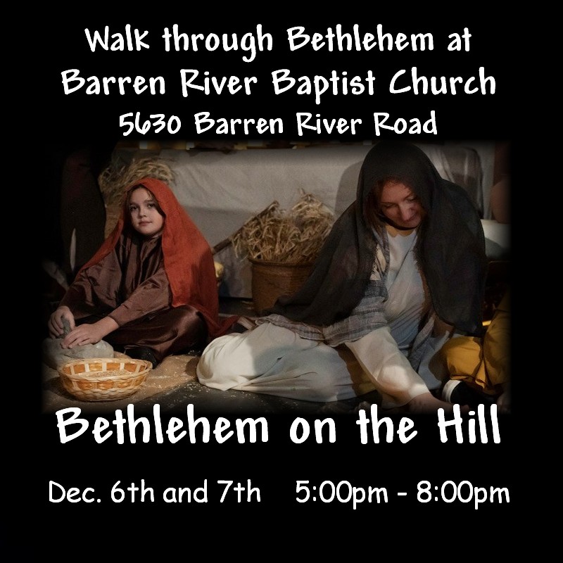 Bethlehem on the Hill is a free, indoor walk through Christmas event (rain or shine) at Barren River Baptist Church located at 5630 Barren River Road. We invite you to experience what Bethlehem might have been like at the time of the birth of Jesus. Be ready to encounter Roman soldiers, wise men, shepherds, village life and stable animals as you look for baby Jesus. Follow the Christmas lights on the path to our fellowship hall and enjoy Christmas refreshments with hot chocolate and cookies. December 6th & 7th. 5:00pm-8:00 pm