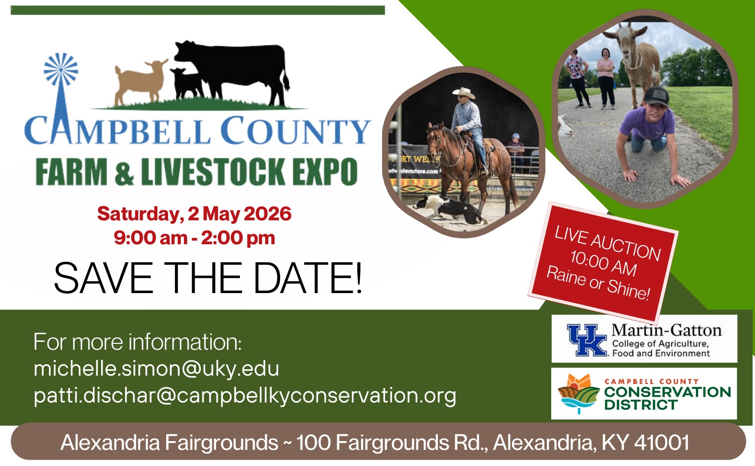COME JOIN US FOR THE CAMPBELL COUNTY FARM & LIVESTOCK EXPO ON SATURDAY, 2 MAY FROM 9 AM TO 2 PM AT THE ALEXANDRIA FAIRGROUNDS. THIS IS A FREE EVENT, RAIN OR SHINE, WHERE YOU WILL BE ABLE TO SEE SHEEP & GOAT HOOF TRIMMING AND SHEARING, PARTICIPATE IN THE TRACTOR DRIVING CONTEST FOR ALL AGES, GET EXPERT ADVICE FROM AG INDUSTRY SPECIALISTS, FREE GLUCOSE CHECK, BID IN THE LIVE EQUIPMENT AUCTION BEGINNING AT 10 AM, AND MORE! THAT’S SATURDAY, 2 MAY, FROM 9 AM TILL 2 PM RAIN OR SHINE. FOR DETAILS, GO ONLINE TO CAMPBELLKYCONSERVATION.ORG. OR CAMPBELL COUNTY EXTENSION SERVICES.