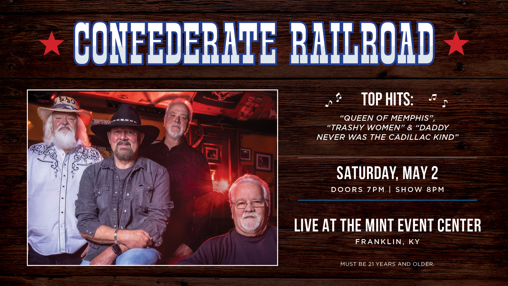 Catch Confederate Railroad live at The Mint Event Center in Franklin, KY, on Saturday, May 2nd at 8 PM. Led by Danny Shirley, the ACM award-winning group will perform signature hits like “Trashy Women” and “Queen of Memphis.” Doors open at 7 PM for this 21+ event.