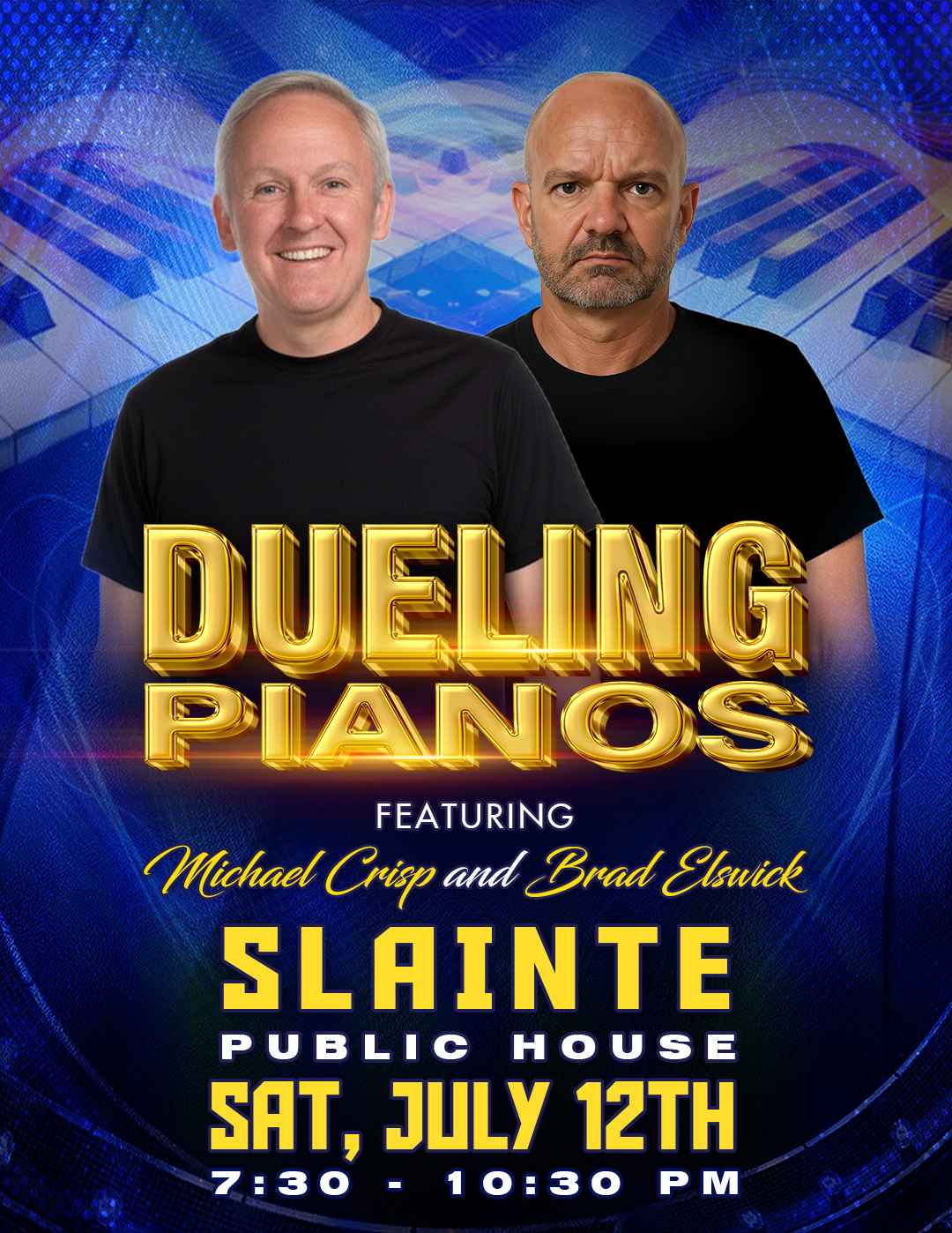 Get ready for an unforgettable night at Sláinte Public House on Saturday, July 12th, as two of our favorite local musicians, Michael Crisp and Brad Elswick, take the stage for a high-energy Dueling Pianos show!