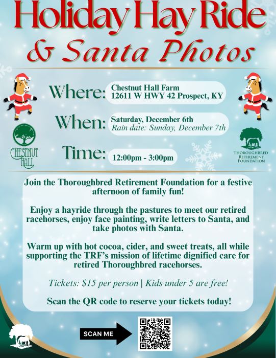 Enjoy a festive afternoon of family fun! Take a hayride and meet retired racehorses, face painting, letters to Santa, and photos with Santa. Enjoy hot cocoa, cider and sweet treats while supporting the Thoroughbred Retirement Foundation’s mission of lifetime dignified care for retired thoroughbred racehorses.