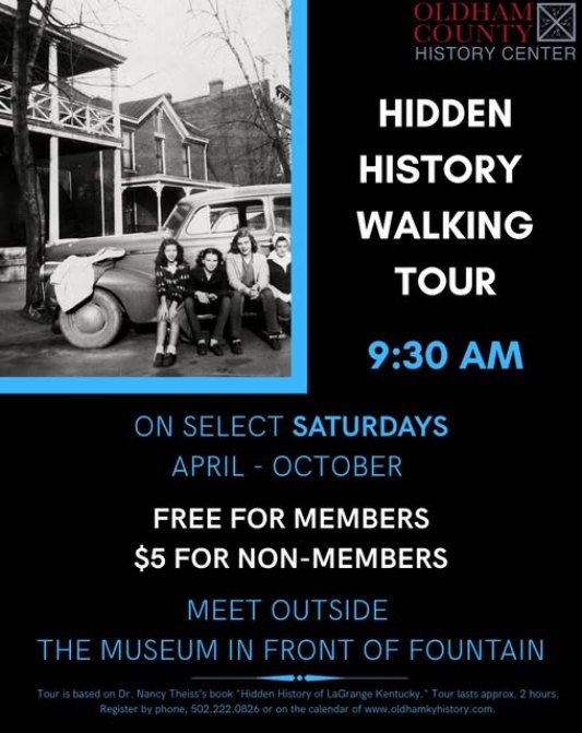 Learn some of the unique history of La Grange by taking a Hidden History Walking Tour led by Dr. Nancy Theiss Executive Director of the Oldham County History Center. Tour is based on her book, Hidden History of La Grange Kentucky. Tour starts at the Peyton Samuel Head Family Museum at the History Center campus.