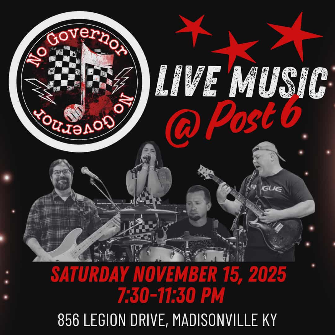 Live music at the American Legion in Madisonville on November 15th featuring the No Governor band. Come hang out with us and consider joining our amazing Legion family.