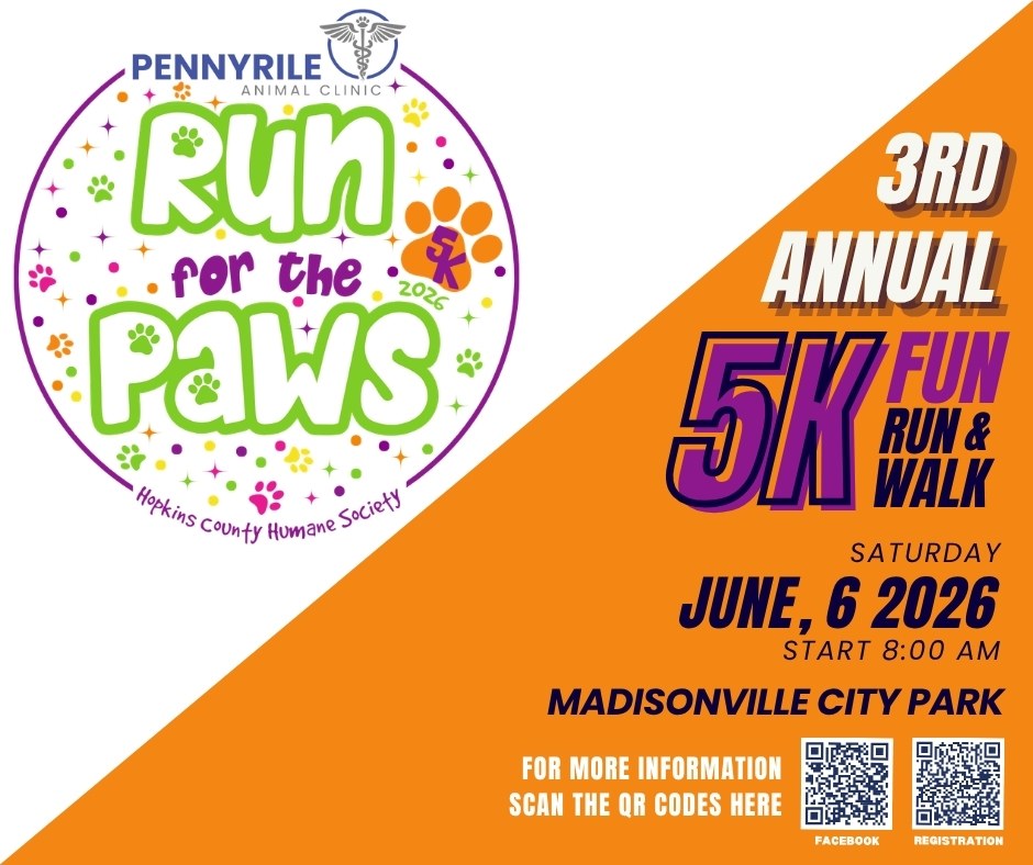 Attention: all animal lovers! Runners, walkers, and 4-legged friends of all ages are invited to Madisonville City Park for our first annual Hopkins County Humane Society RUN FOR THE PAWS 5K Run/Walk and Kids Fun Run.