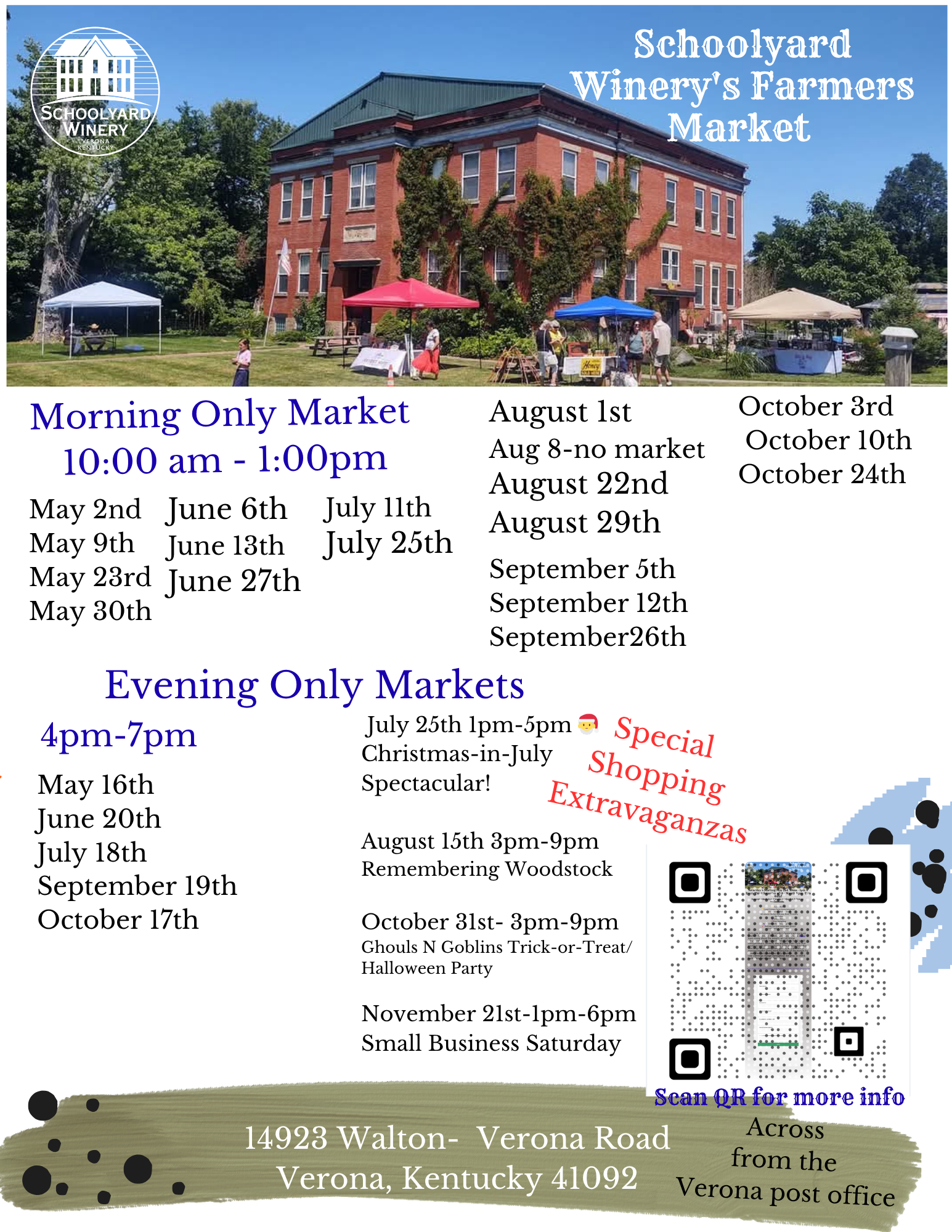 Follow Schoolyard Winery and Schoolyard Winery Farmers Market on Facebook for weekly updates and special events.