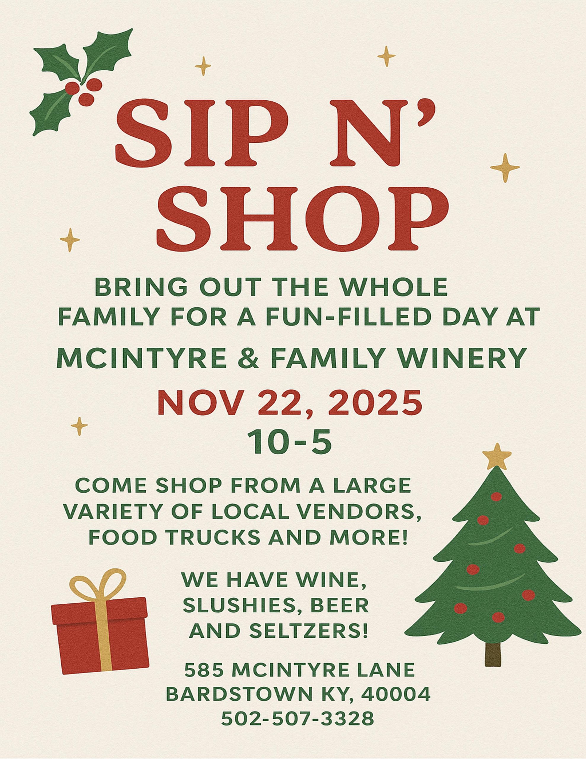 Come out to McIntyre and Family Winery November 22 for our semi-annual sip n shop event. This family fun event will feature local artist, crafters, food trucks and more! This is one of our biggest events that we host here and have been doing this event for 6 years now. Some things to expect to see will be baked goods, pottery, boutiques, makeup and skin care products, candles, jewelry, crochet items and many more crafts! There will be something for everyone!