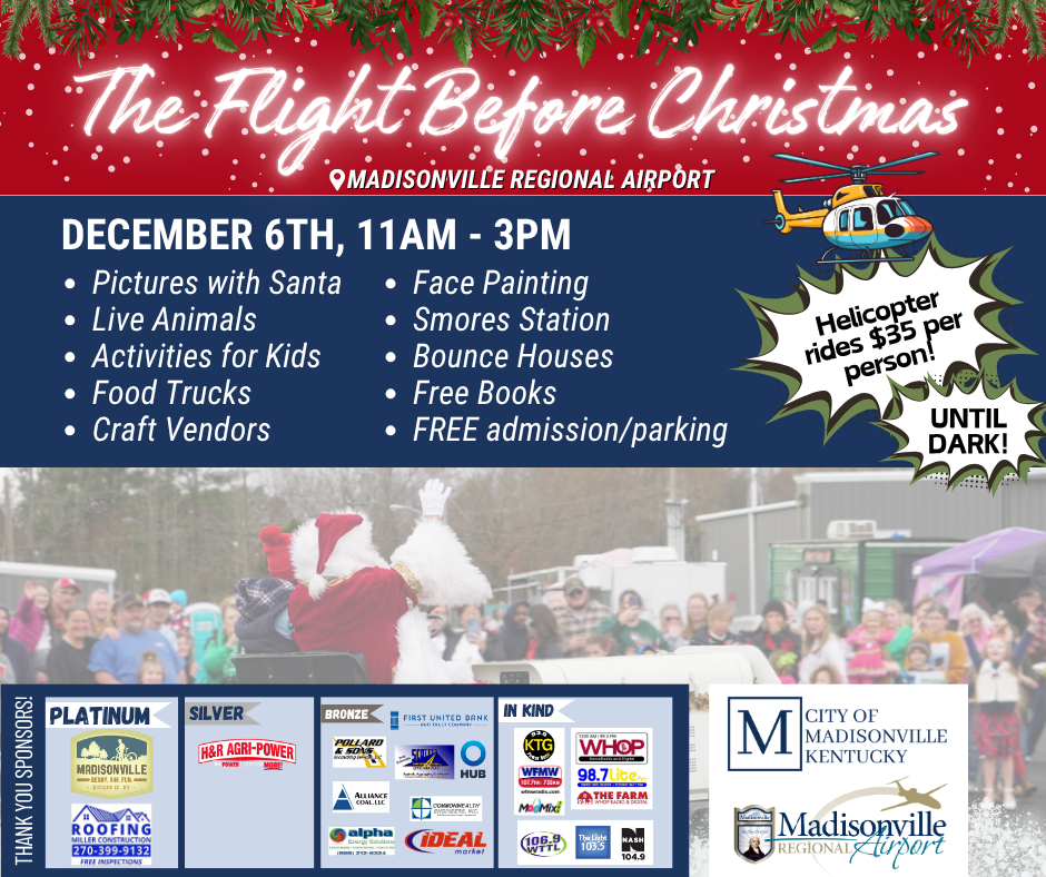 The City of Madisonville invites families and visitors to kick off the holiday season with a festive community event, The Flight Before Christmas, at the Madisonville Regional Airport on Saturday, December 6, 2025, from 11:00 a.m. to 3:00 p.m. (with helicopter rides available until 5:00 p.m.).