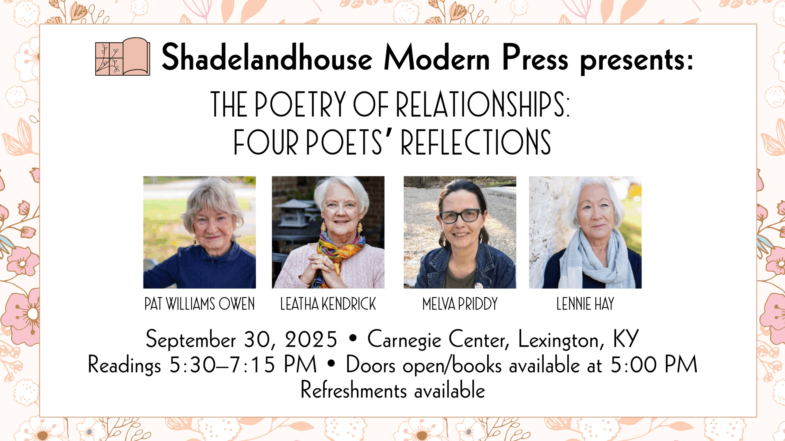 Shadelandhouse Modern Press, an award-winning independent book publisher in Lexington, Kentucky, presents a poetry reading and discussion featuring four notable Kentucky women poets: Pat Williams Owen (Louisville, Kentucky), Leatha Kendrick (Lexington, Kentucky), Melva Sue Priddy (Winchester, Kentucky), and Lennie Hay (Louisville, Kentucky). Free event. Doors open at 5:00 PM. Program begins at 5:30 PM.