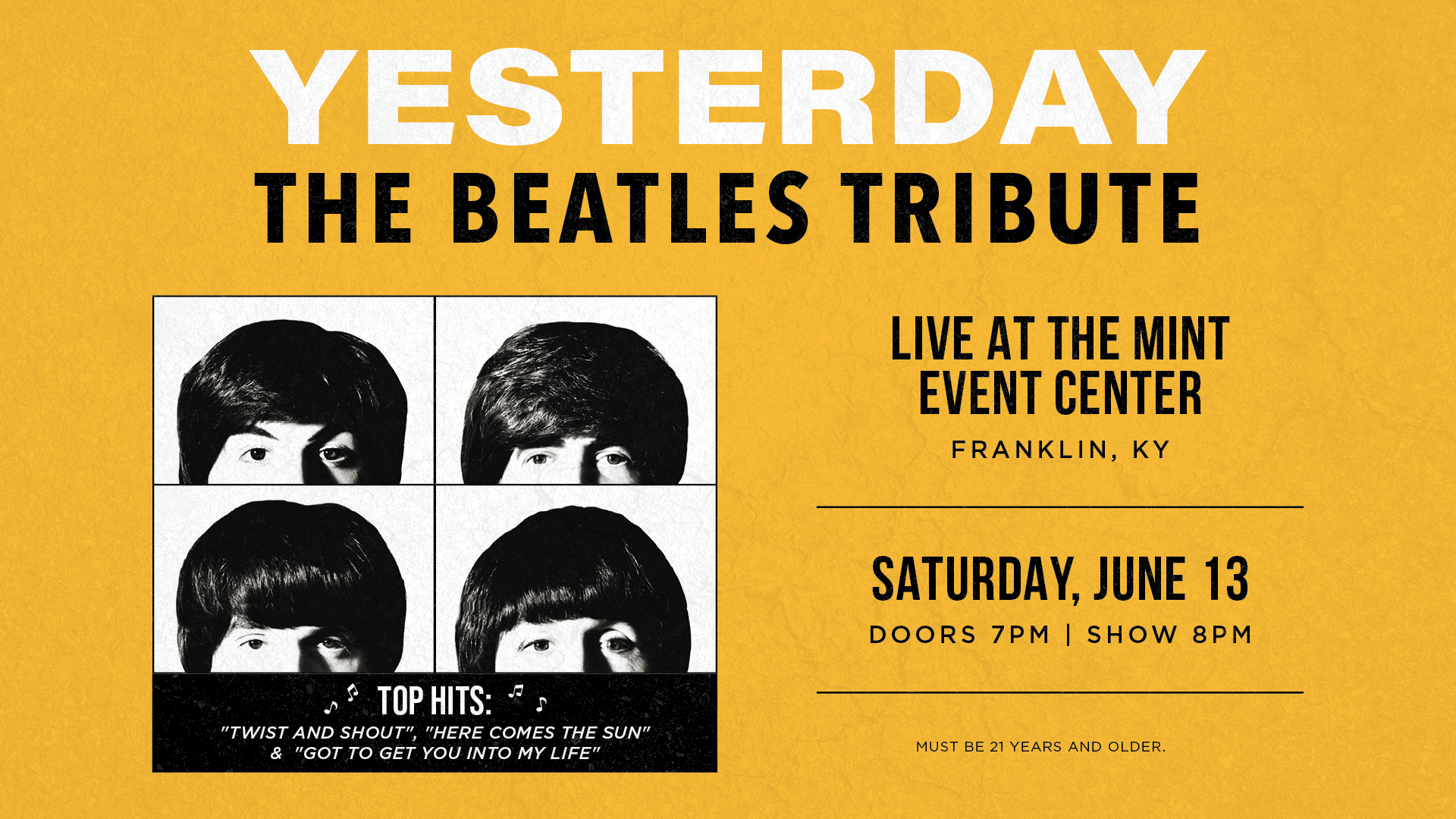 Experience Yesterday: The Beatles Tribute live at The Mint Event Center in Franklin, KY, on Saturday, June 13th at 8 PM. Doors open at 7 PM for this 21+ event!
