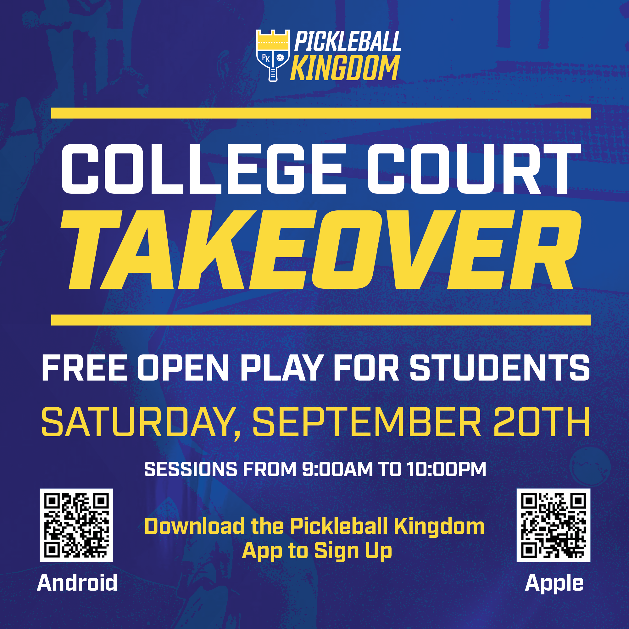 College Court Takeover at Pickleball Kingdom Sep 20 9:00 AM - 10:00 PM College Court Takeover at Pickleball Kingdom