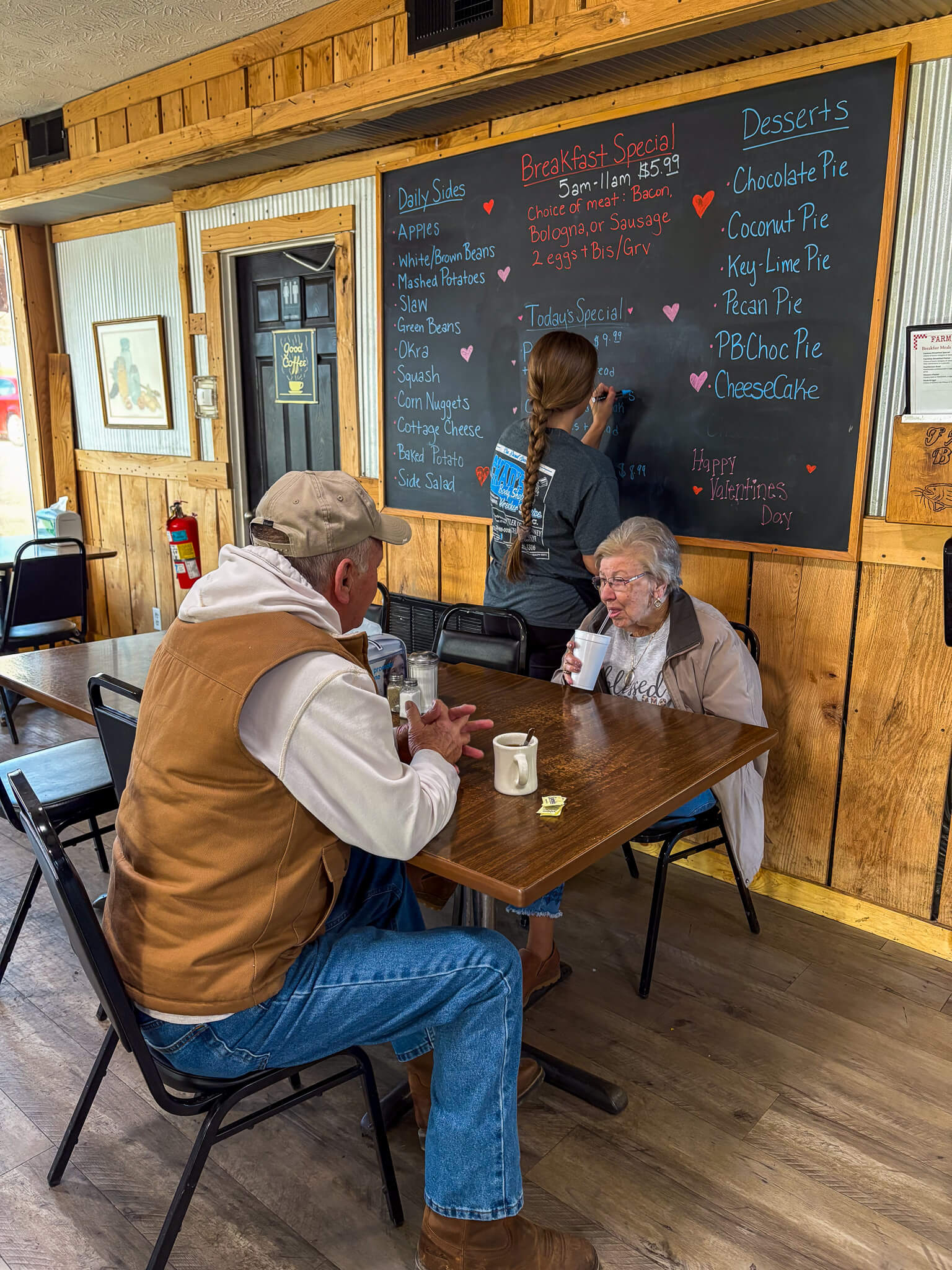 Regulars catch up beneath the chalkboard menu at The Farmboy Restaurant, where daily specials and homemade desserts are always front and center. Photo: Wade Harris
