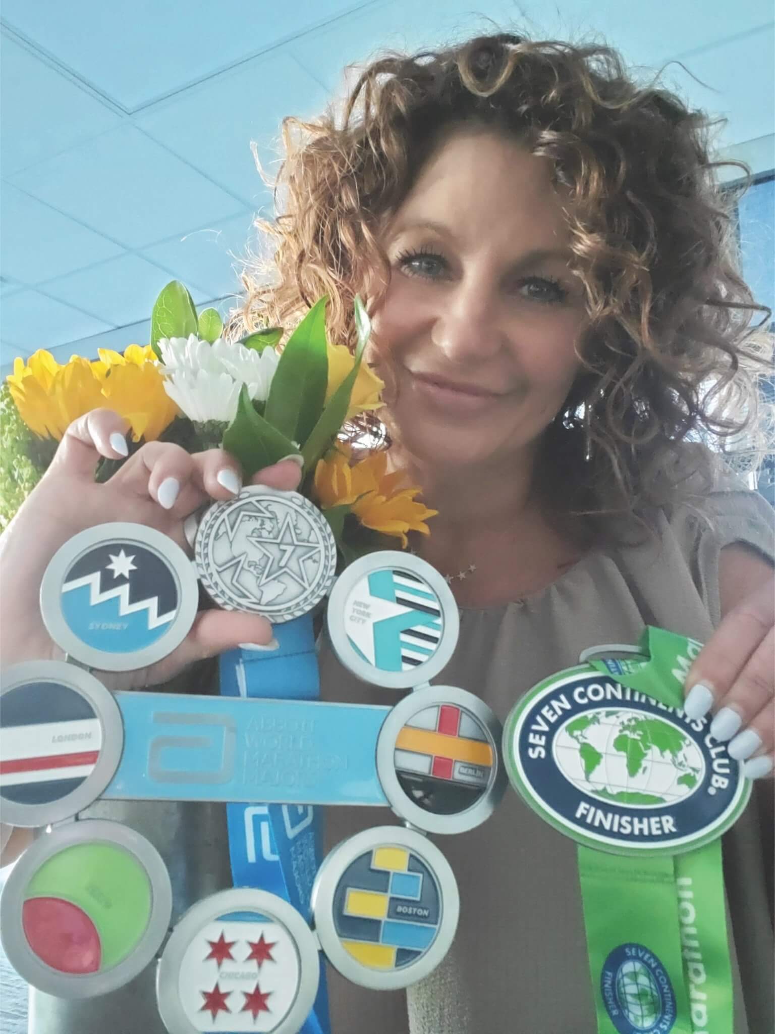 Vicky Payne displays her medals, including the Seven Continents Club Finisher medal. Photo: Vicky Payne