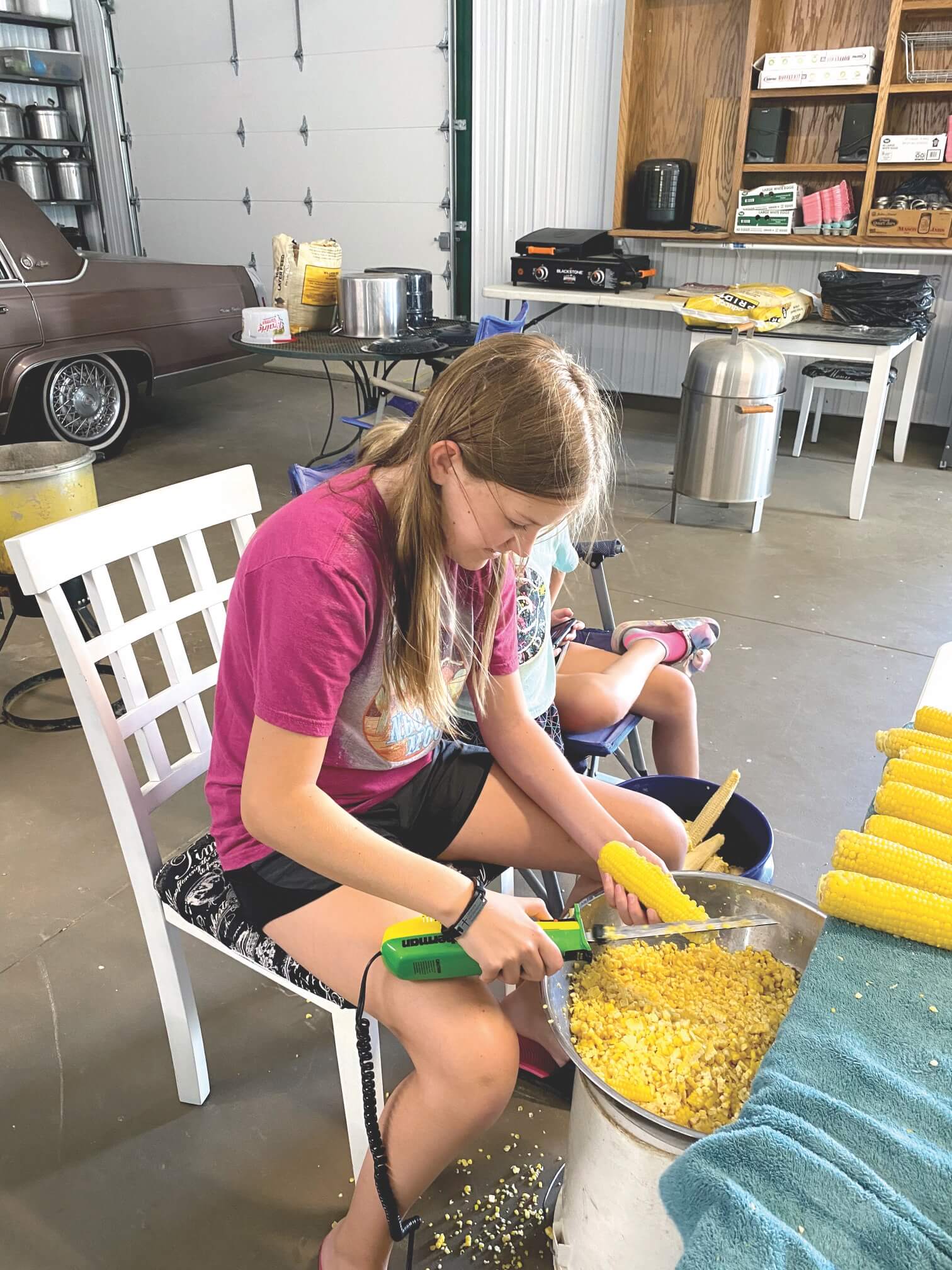 Chuck and Connie Metcalfe’s granddaughters love to help during canning season. Gracie Graham, top, shucks corn and Aubree Robbins cuts kernels off the cob. Photo: Chuck Metcalfe