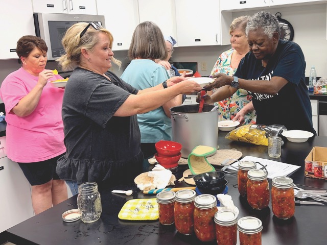 Violet Graves scoops out salsa for participants during a canning class at the Adair County Extension Office. Photo: Dylan Gentry