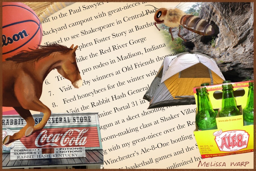 It began with a visit to the Paul Sawyier Library in Frankfort for a book signing by former University of Kentucky basketball great—now broadcast personality—Jack “Goose” Givens. Then came a backyard campout with four young great-nieces and nephews, Shakespeare in Central Park in Louisville, The Stephen Foster Story at Bardstown, hiking the Red River Gorge and a cave tour. She saw her first pro rodeo in Madison, Indiana, gave carrots to two Kentucky Derby winners at Old Friends thoroughbred retirement farm near Georgetown, and fed honeybees for the winter with Shelby County beekeeper Pat Hornback.