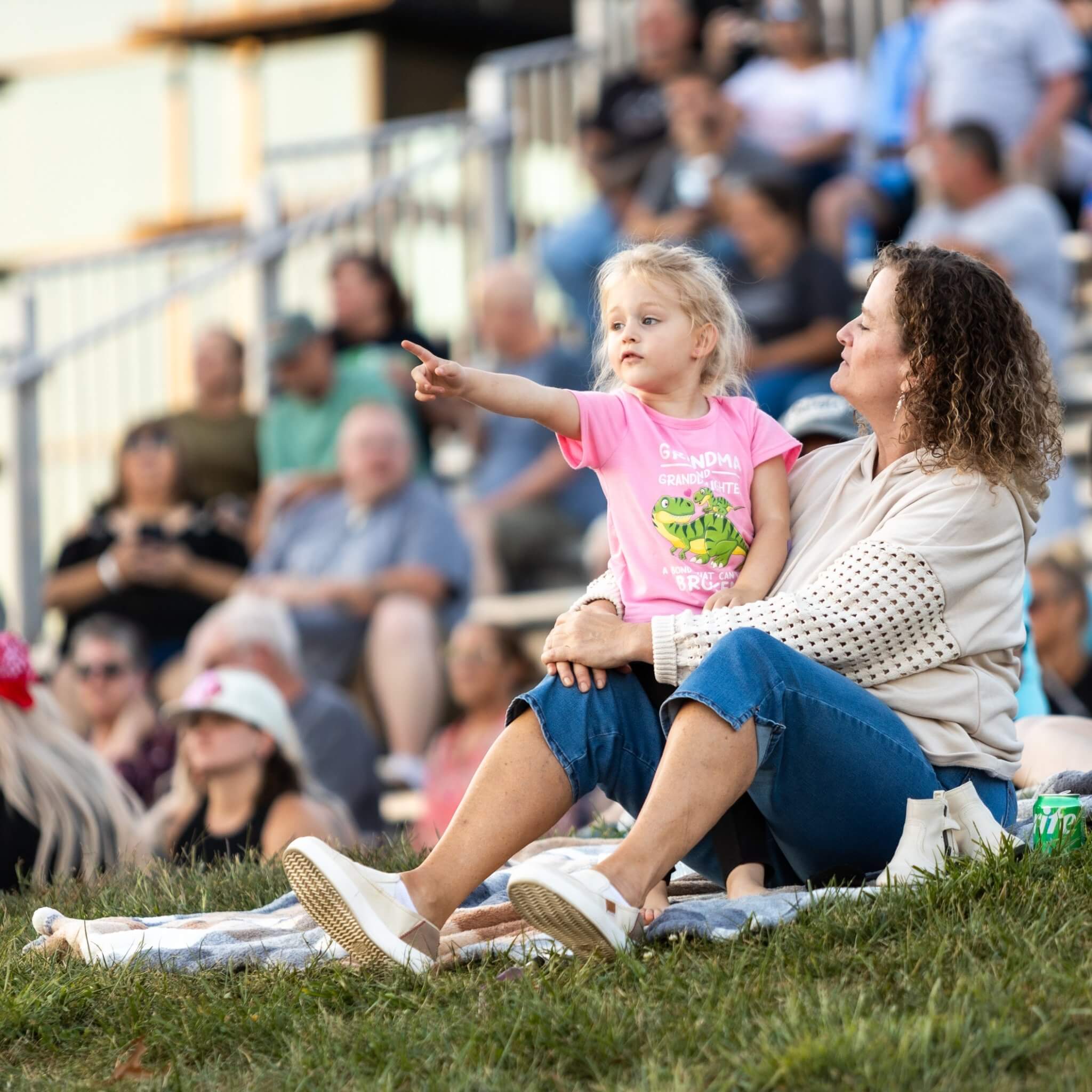 A young girl points toward the stage while sitting on the hillside, capturing the family-friendly spirit of a summer night at The Amp.