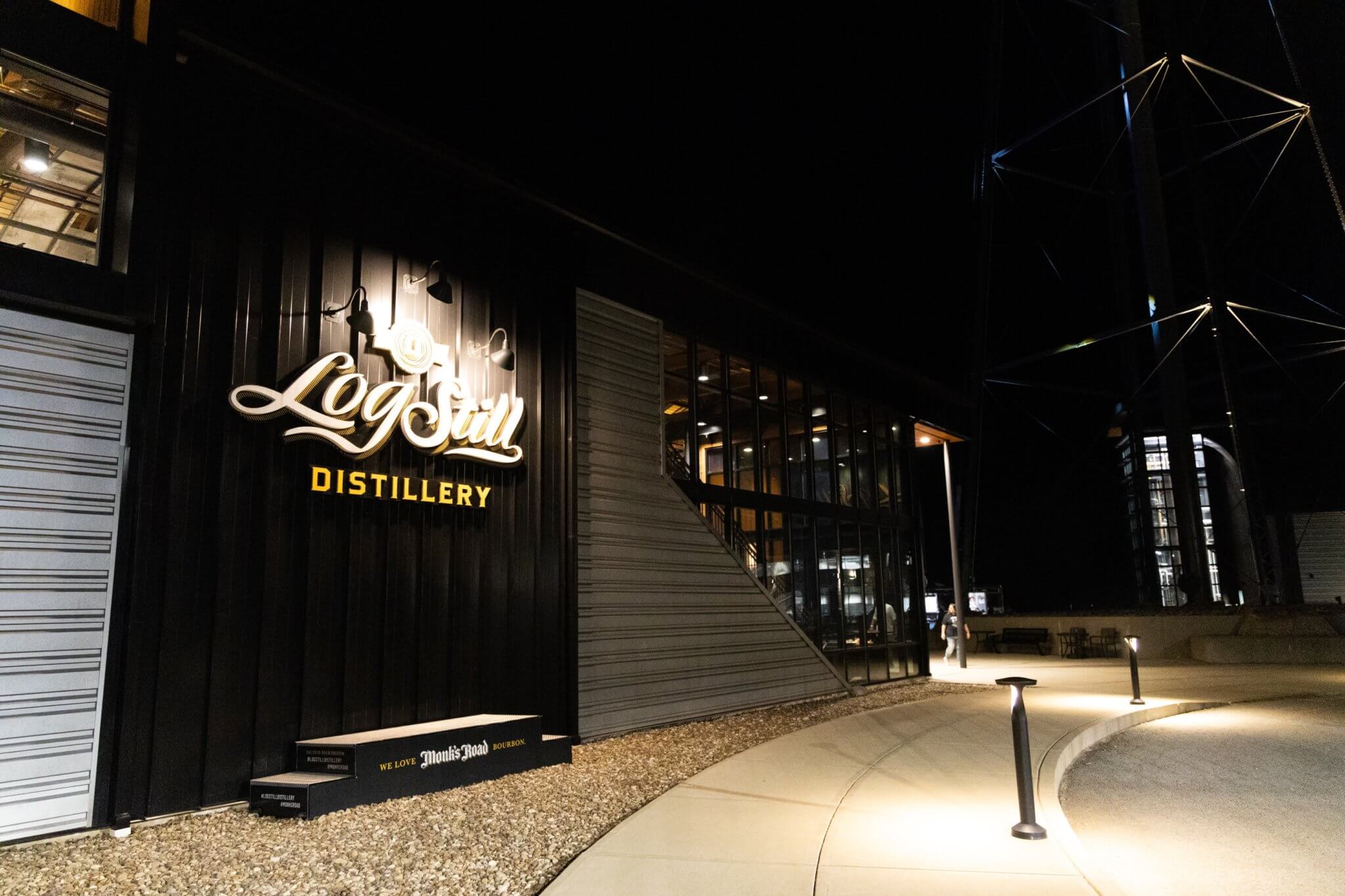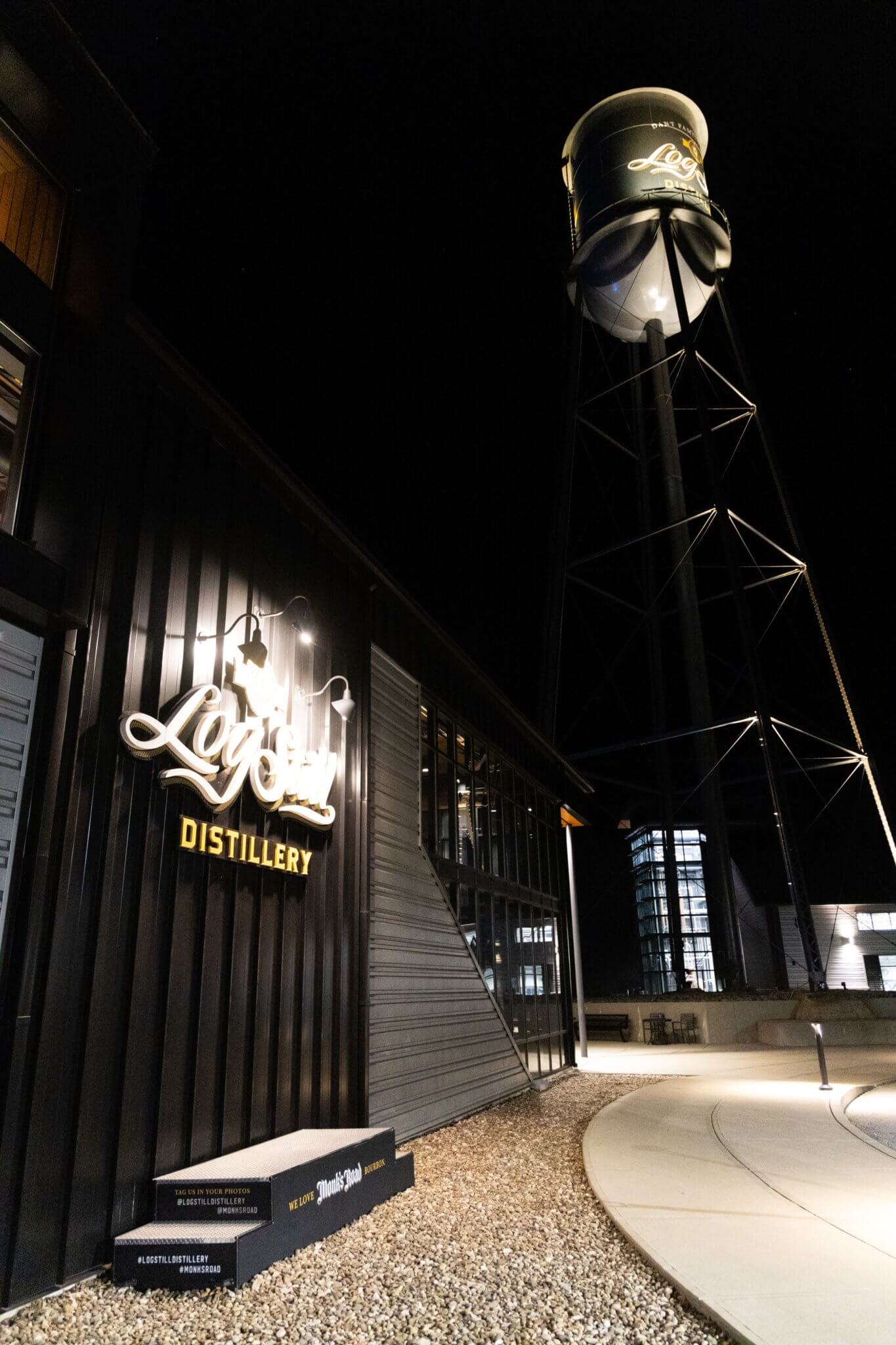 The Log Still Distillery campus glows at night beneath its iconic water tower, where modern design and bourbon heritage meet.