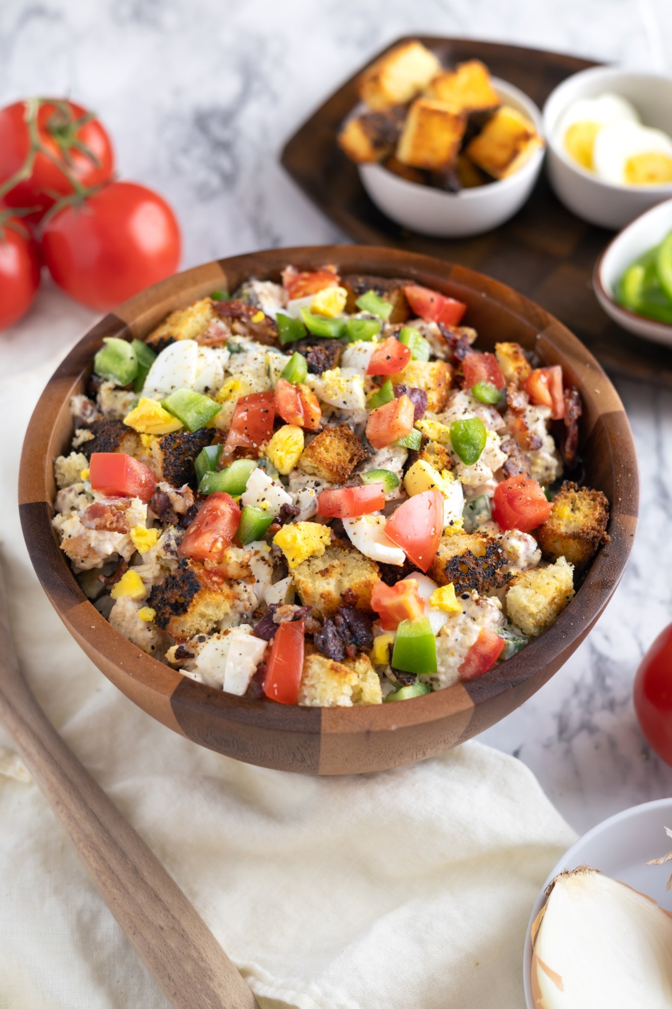 Prepare and dice hard-boiled eggs. Make cornbread using your desired recipe or a store-bought version. In a large bowl, combine all the ingredients, except mayonnaise, and stir. Add 2 cups mayonnaise, then mix, adding more as needed until salad is moist and comes together. Place in large serving bowl, cover with plastic wrap and place in fridge to chill overnight. Yields 10 servings.