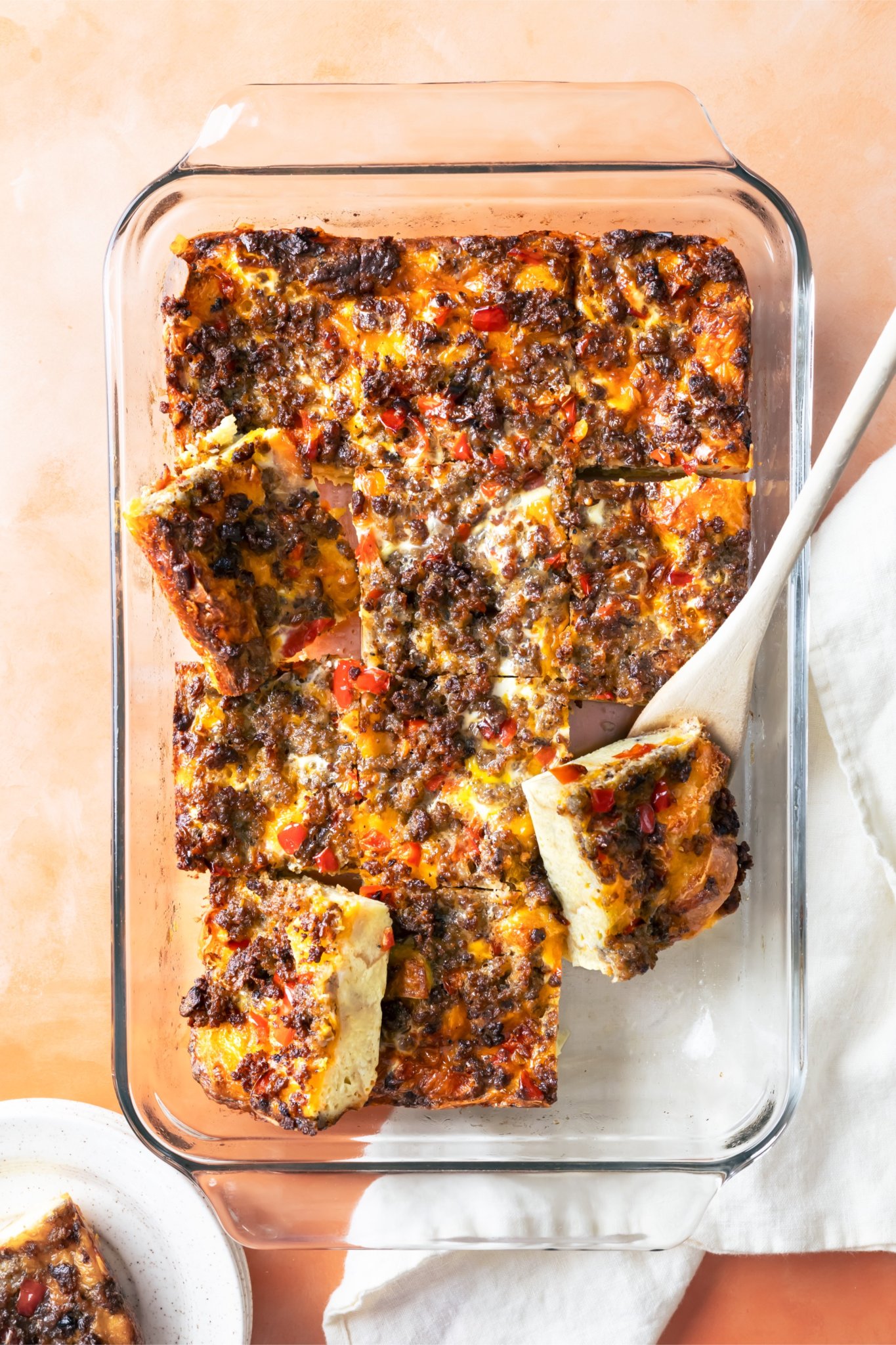 Preheat oven to 350° and grease a 9×13-inch baking dish with nonstick spray. Cook sausage in a large skillet over medium heat, breaking it into small pieces, until it’s browned and crispy. While sausage cooks, cube bread, dice red pepper and grate cheese. When sausage is nearly done, add diced pepper to the skillet and cook 2–3 minutes, until softened. Use a slotted spoon to transfer mixture to a plate lined with paper towels. Whisk eggs, milk, salt and pepper in a large bowl. Spread cubed bread evenly in the bottom of prepared baking dish. Layer shredded cheese on top, followed by sausage and red pepper mixture. Pour egg mixture evenly over the top. Bake 45–50 minutes, or until center is set and top is golden. Let cool 5–10 minutes before serving. Serves 8.